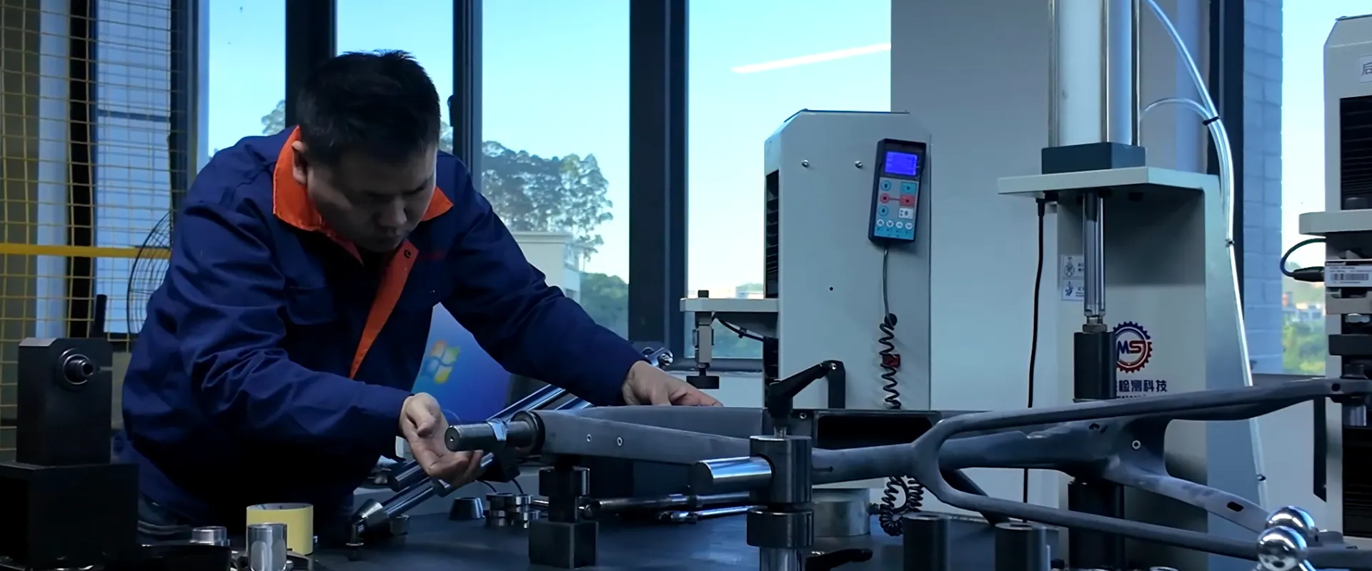 Our carbon fiber bike frame passes a rigorous Horizontal Fatigue Test, enduring 100,000+ cycles of fore/aft loads to ensure durability and meet top safety standards.